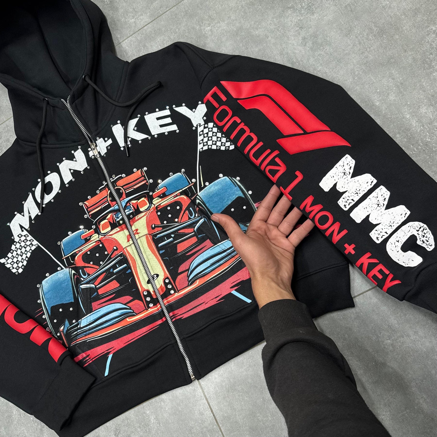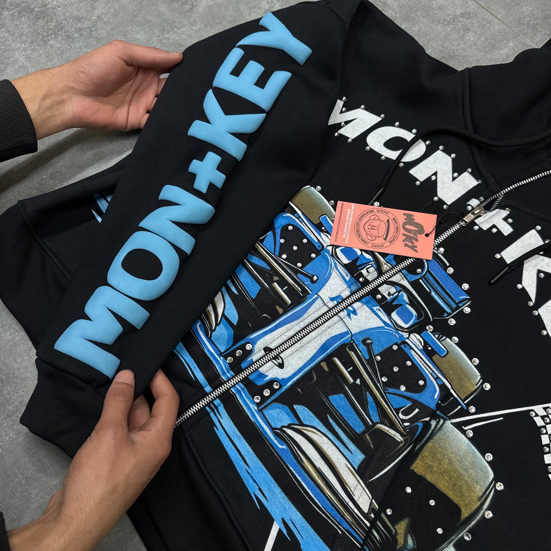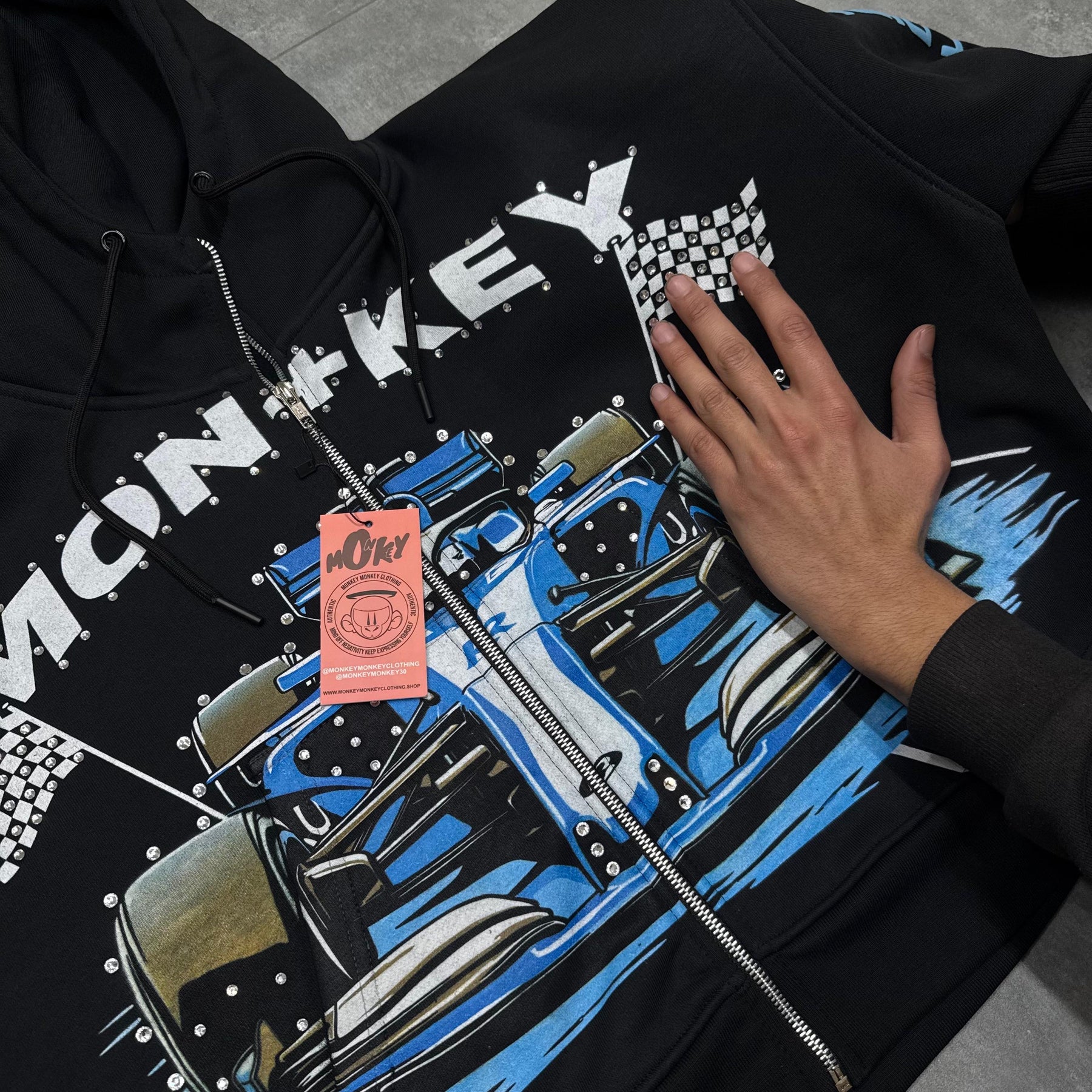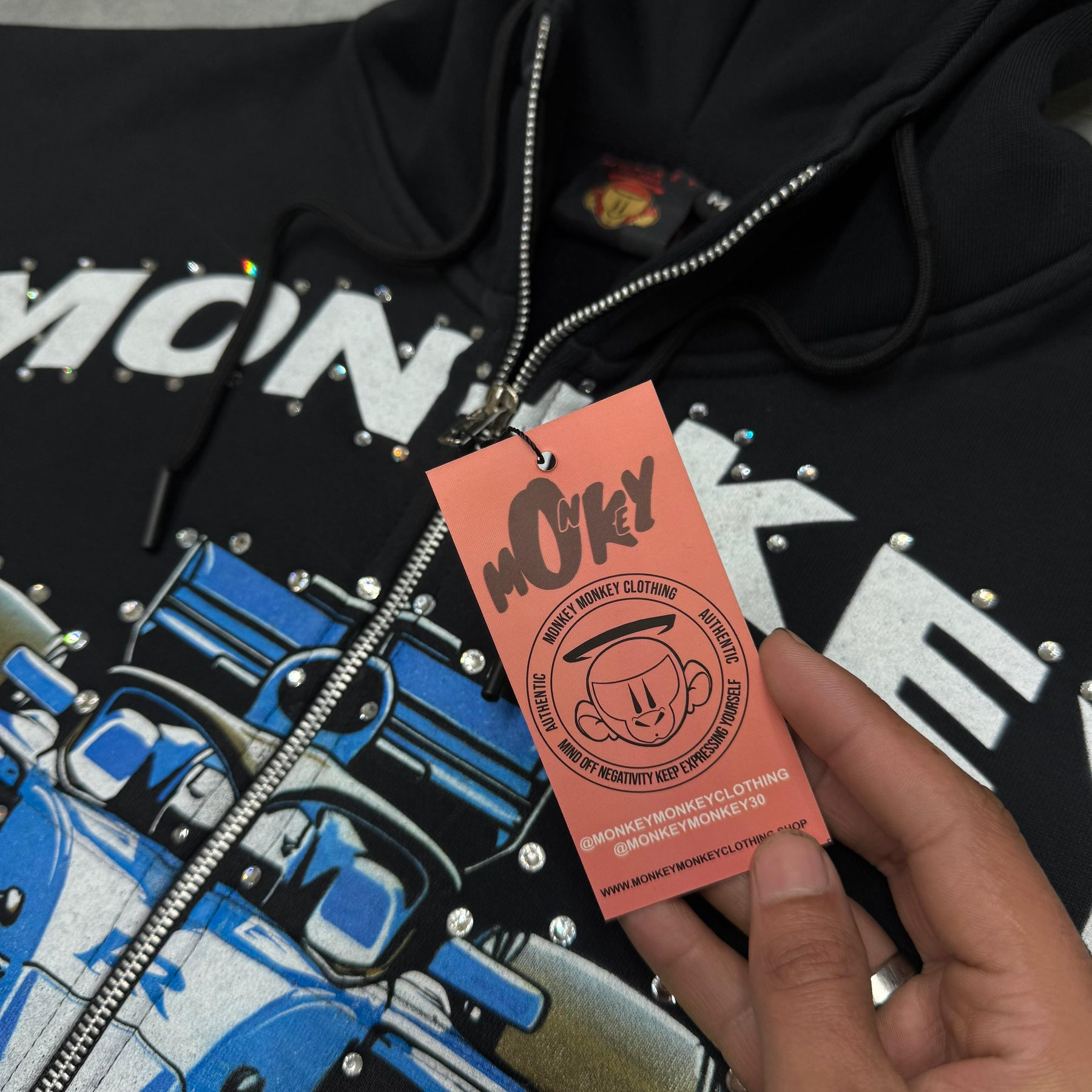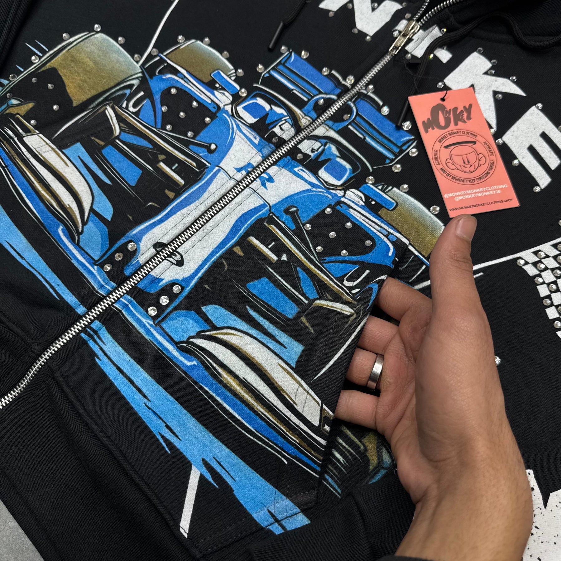 Hand placed rinds-tones all over front pocket hood .