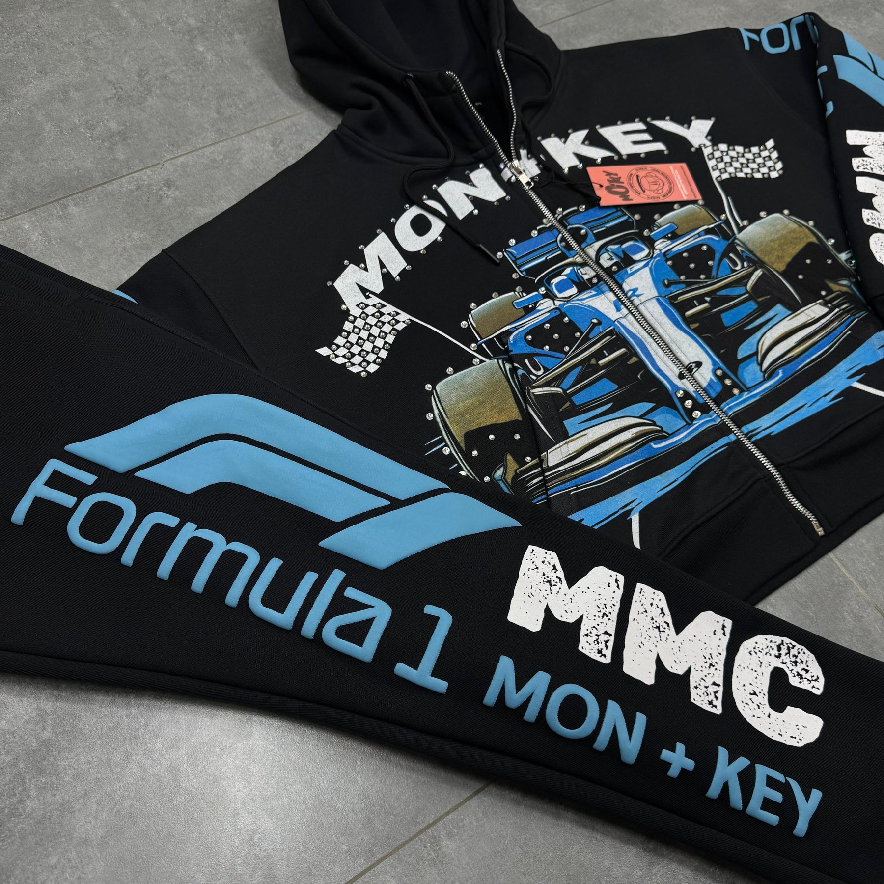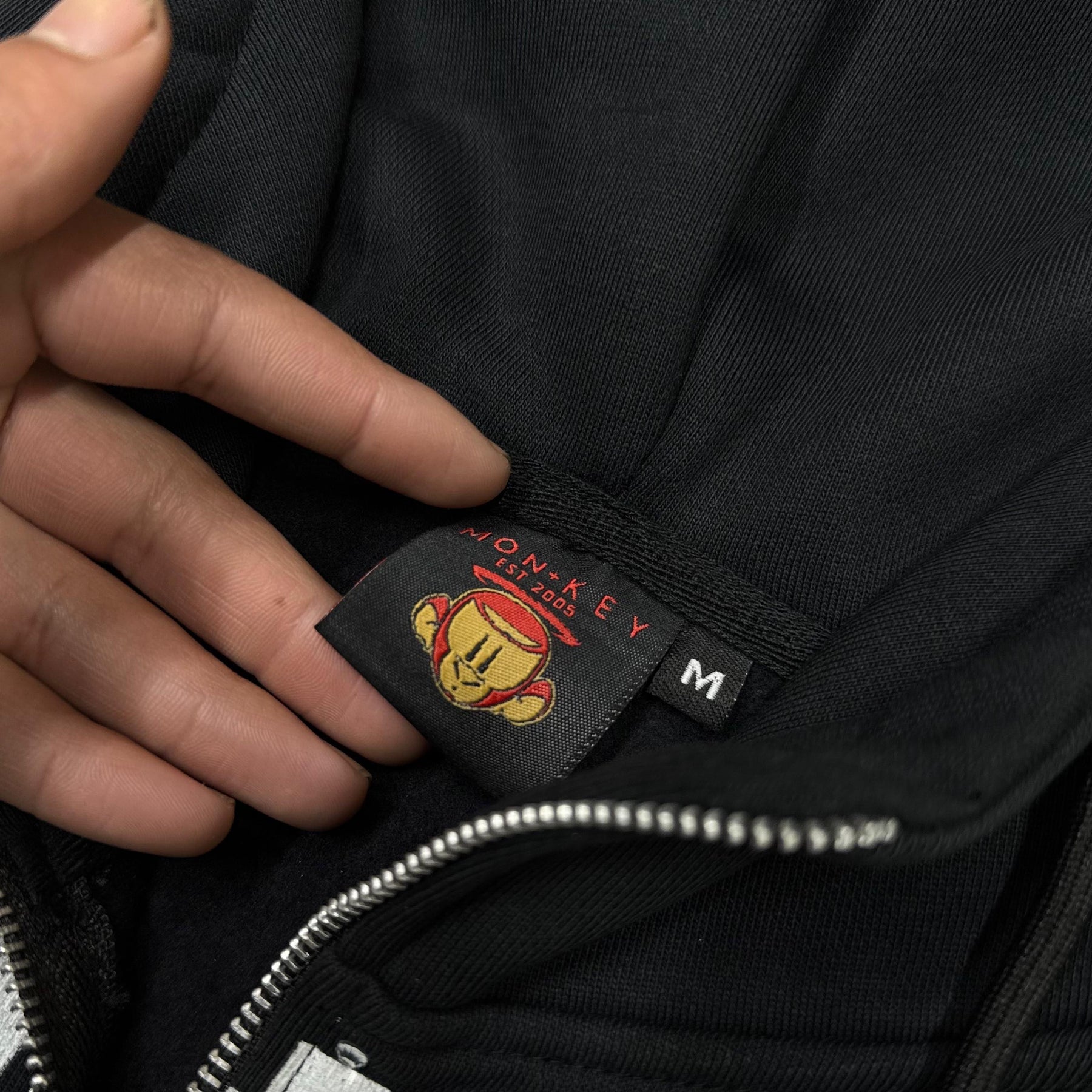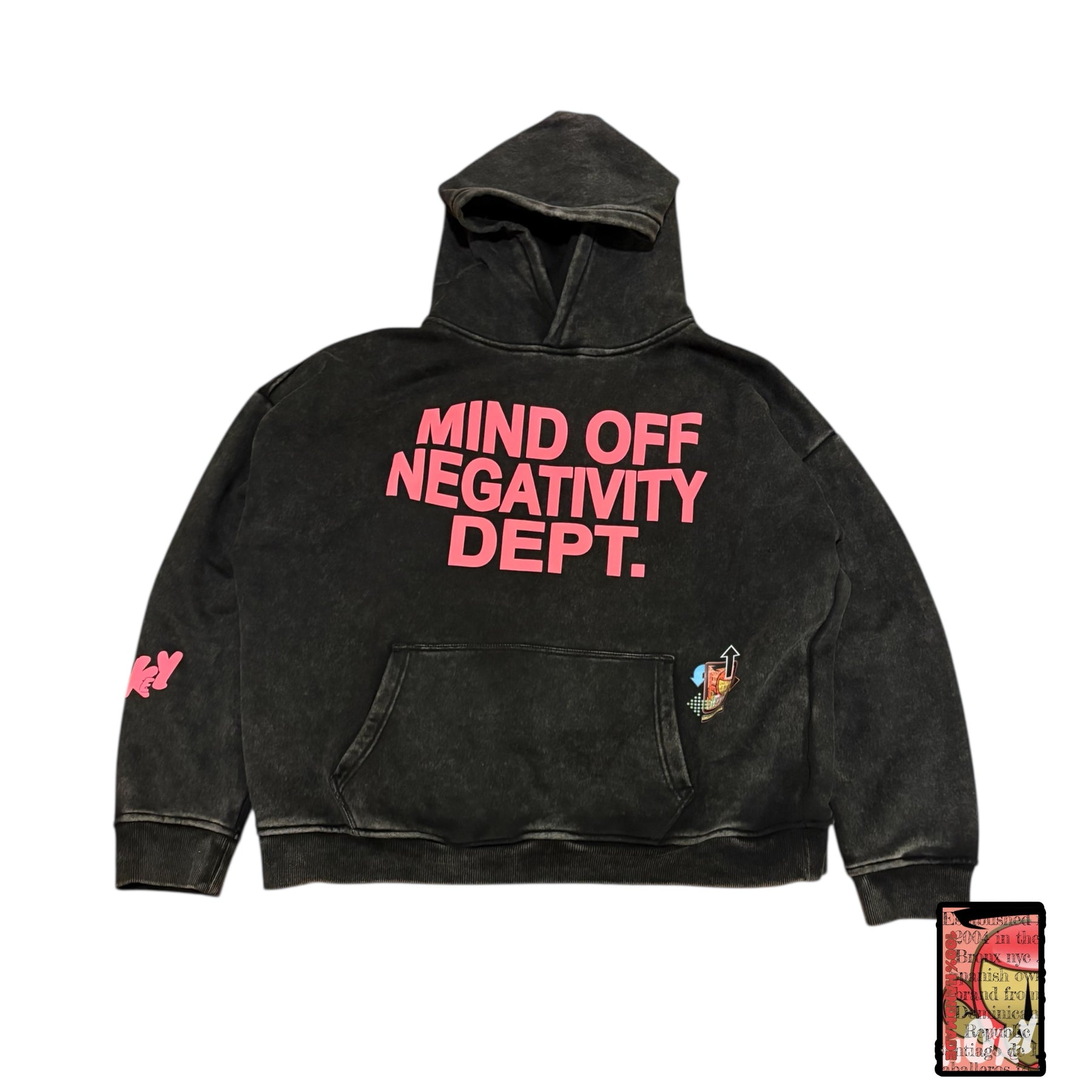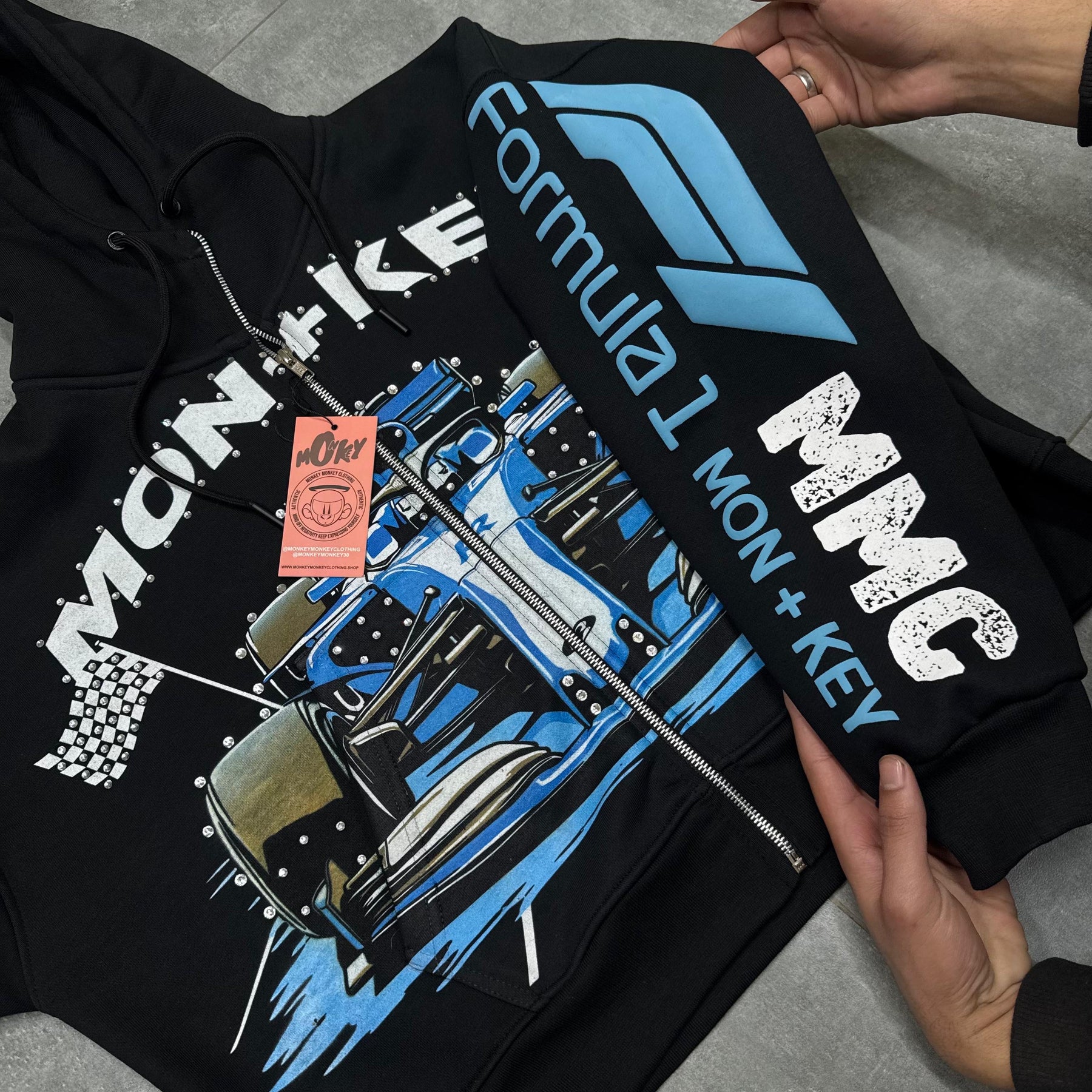 Hand placed rinds-tones all over front pocket hood .