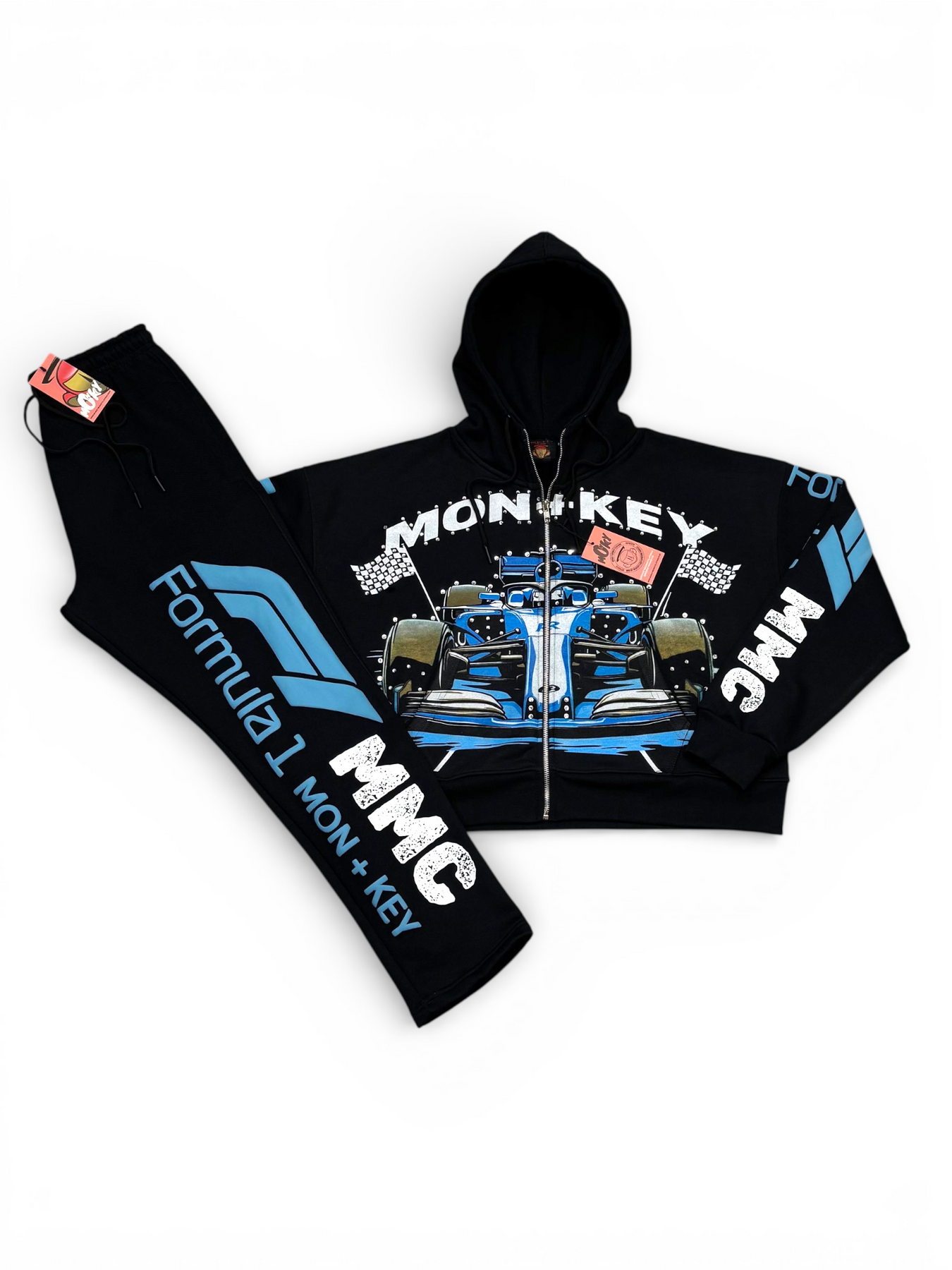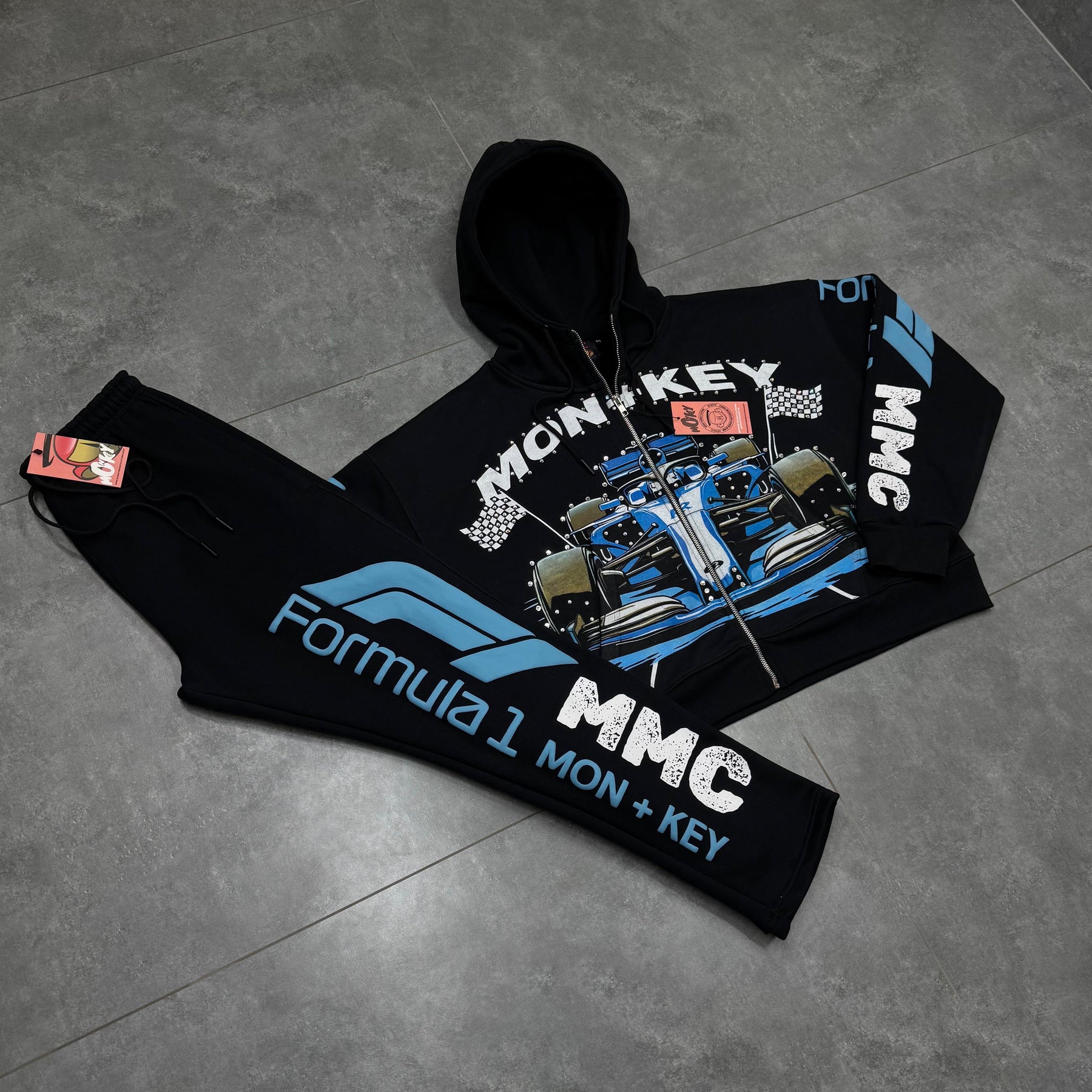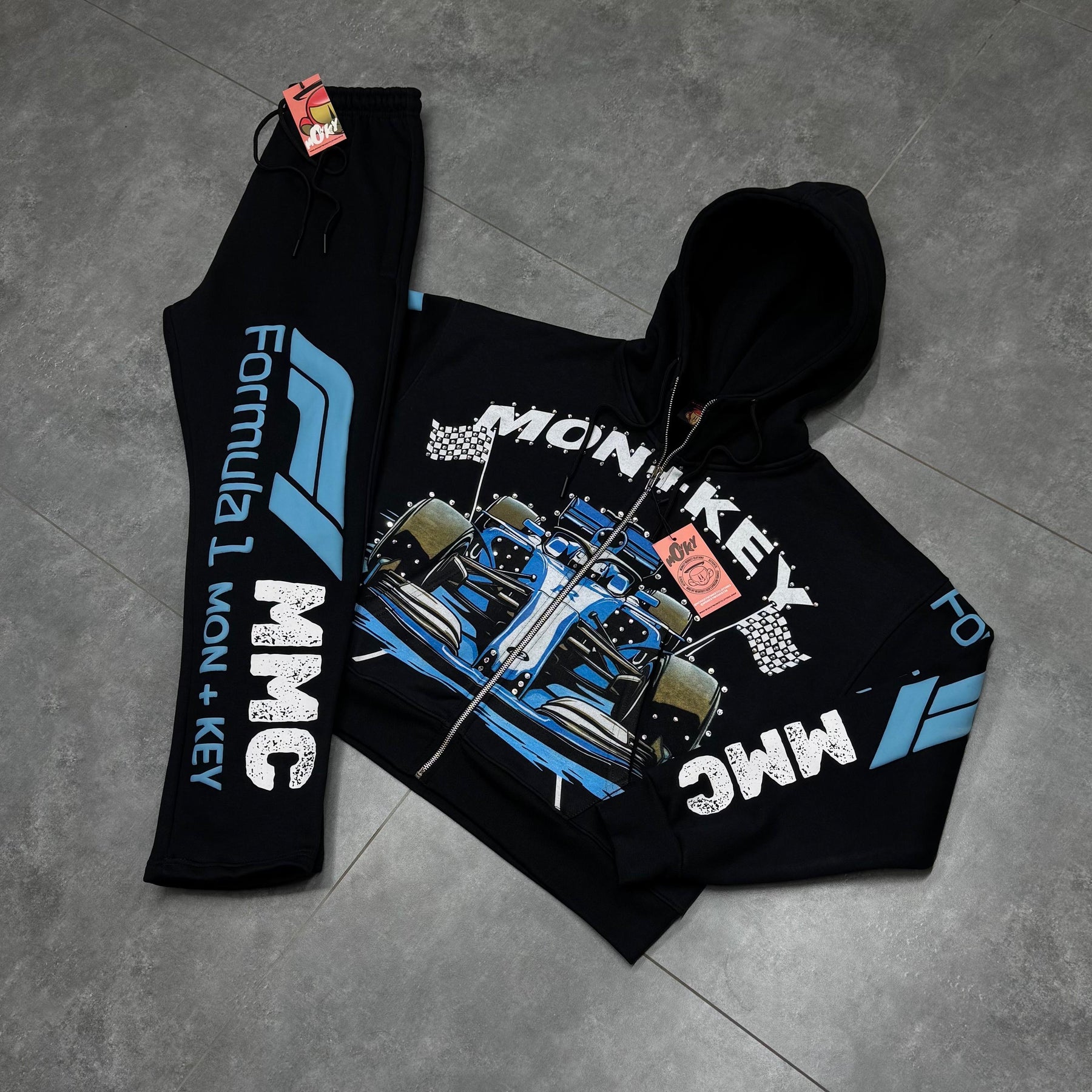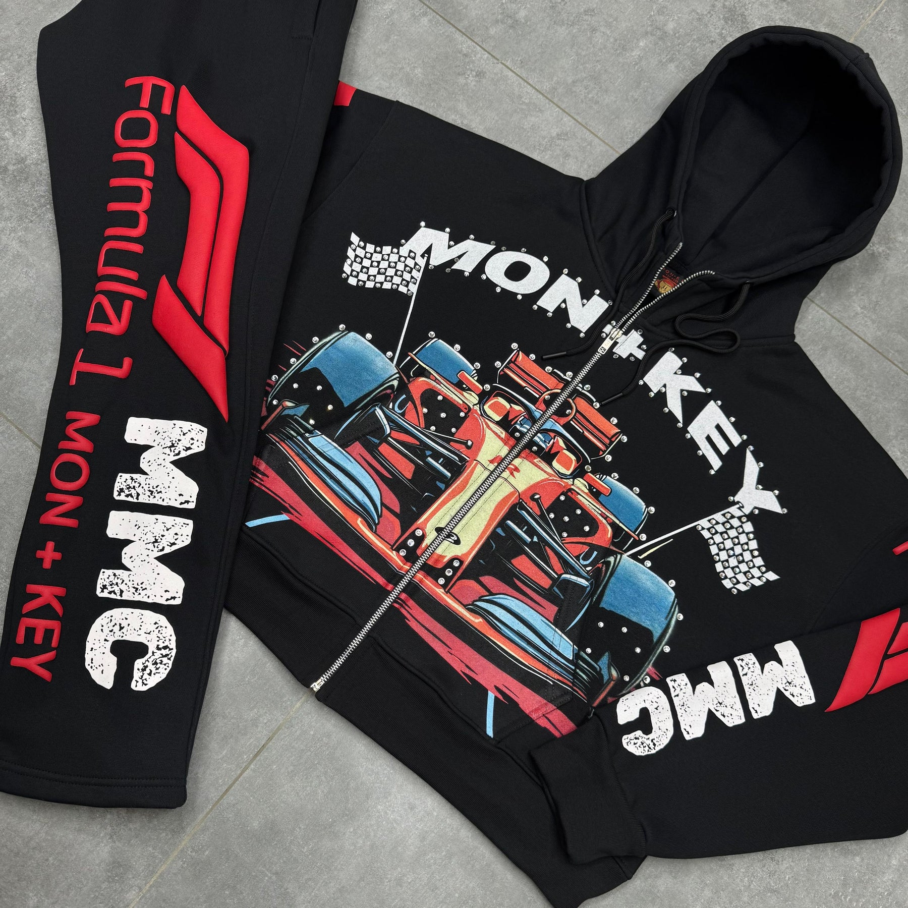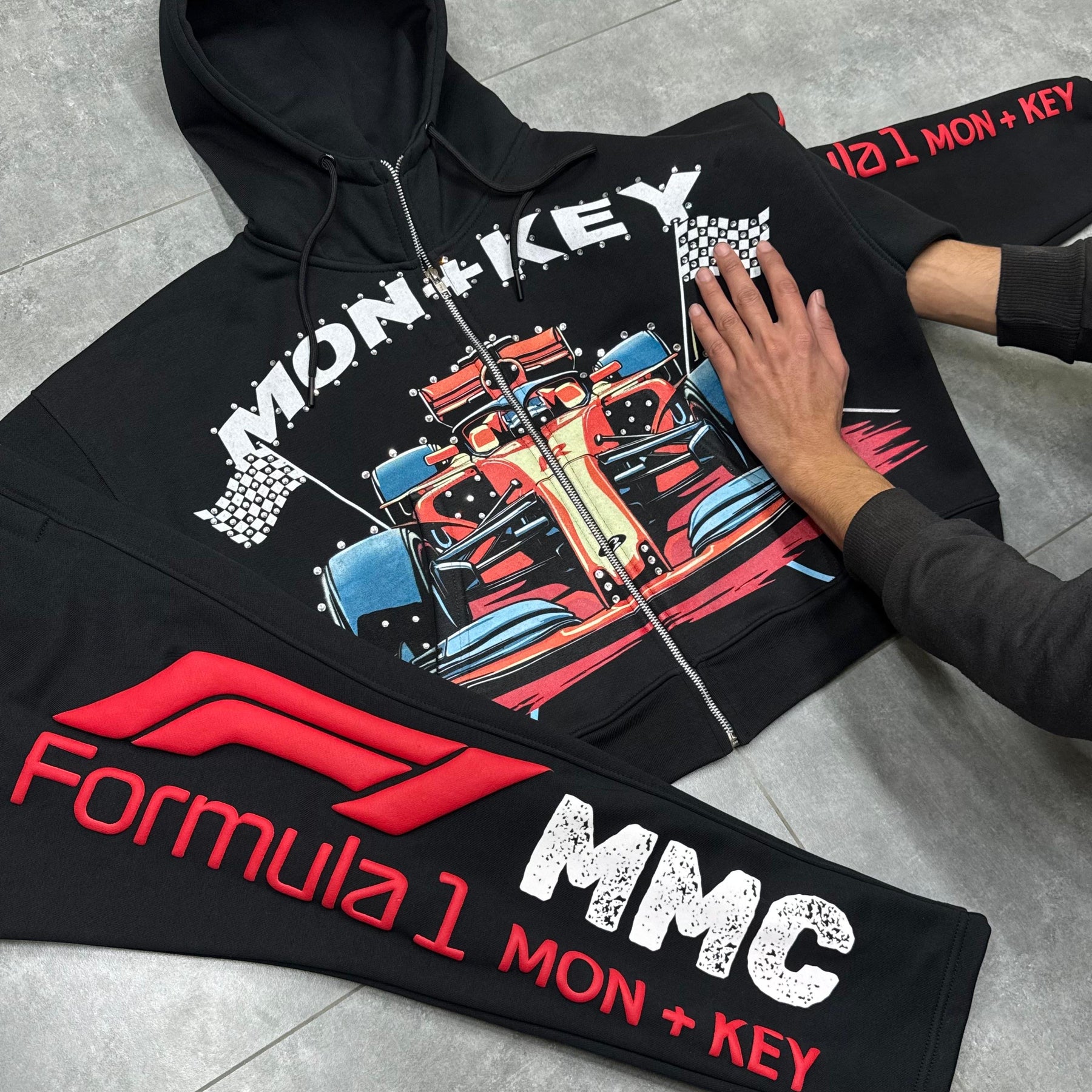 Hand placed rinds-tones all over front pocket hood .